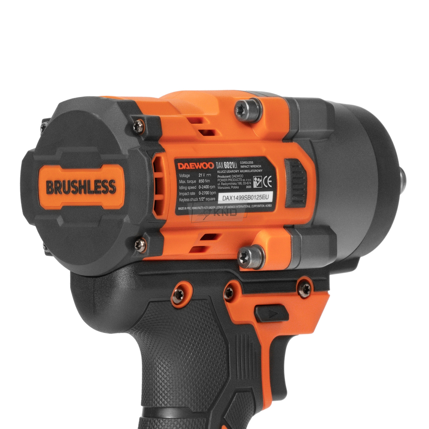 DAEWOO DAX 6021Li – это мощный аккумуляторный ударный гайковерт, предназначенный для профессионального использования, где требуется высокий крутящий момент и мобильность. Обладая крутящим моментом в 850 Нм, он легко справляется с самыми сложными задачами, такими как затяжка и ослабление колесных гаек, болтов и других крепежных элементов.