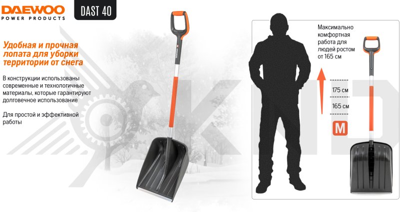 Лопата для уборки снега DAEWOO DAST 40 используется в зимний период для уборки территорий от снега. Ребра жесткости усиливают полотно и предотвращают деформацию при работе с мокрым снегом. Лопата укомплектована легким алюминиевым черенком с v-образной рукояткой, она позволяет надежно ухватится за инструмент и предотвращает проскальзывание черенка в руке. Кромка полотна защищена от сколов алюминиевой планкой, что продлевает срок службы инструмента.